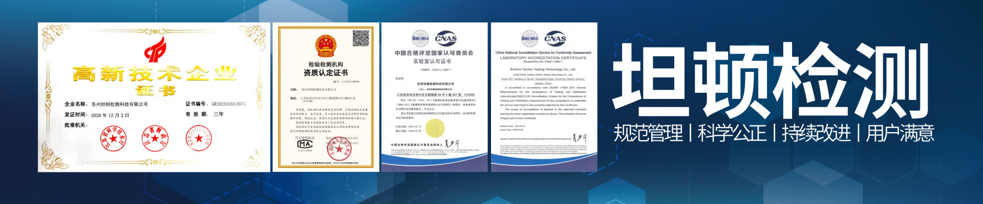 苏州坦顿检测科技有限公司(简称:TD)成立于2018年,公司主要为客户提供第三方检测、认证、质量鉴定及咨询培训等技术服务。公司先后取得CNAS实验室认可证书(证书编号:L15967) , CMA检验检测机构资质证书(证书编号:211021340090),国家高新技术企业(证书编号:GR202032013075),及科技型中小企业等资质及荣誉。